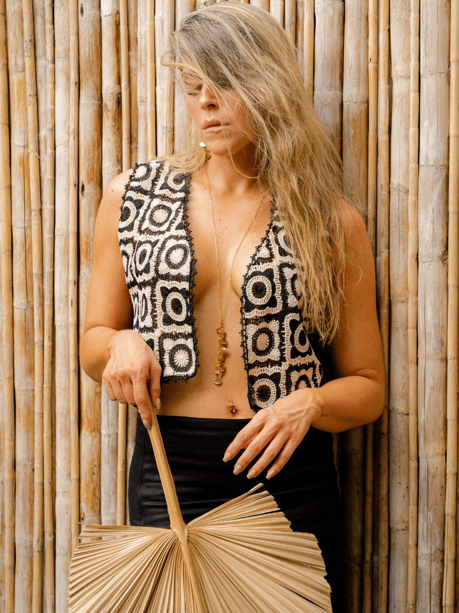 Nuestro chaleco corto sin mangas está tejido en crochet, combinando los colores blanco y negro para crear un diseño elegante y versátil. Su estilo abierto lo convierte en una prenda ideal para superponer sobre tops o blusas, añadiendo un toque artesanal y bohemio a cualquier look. El tejido de crochet permite una textura ligera y aireada, perfecta para los días cálidos o para darle un toque chic a tus outfits de temporada.