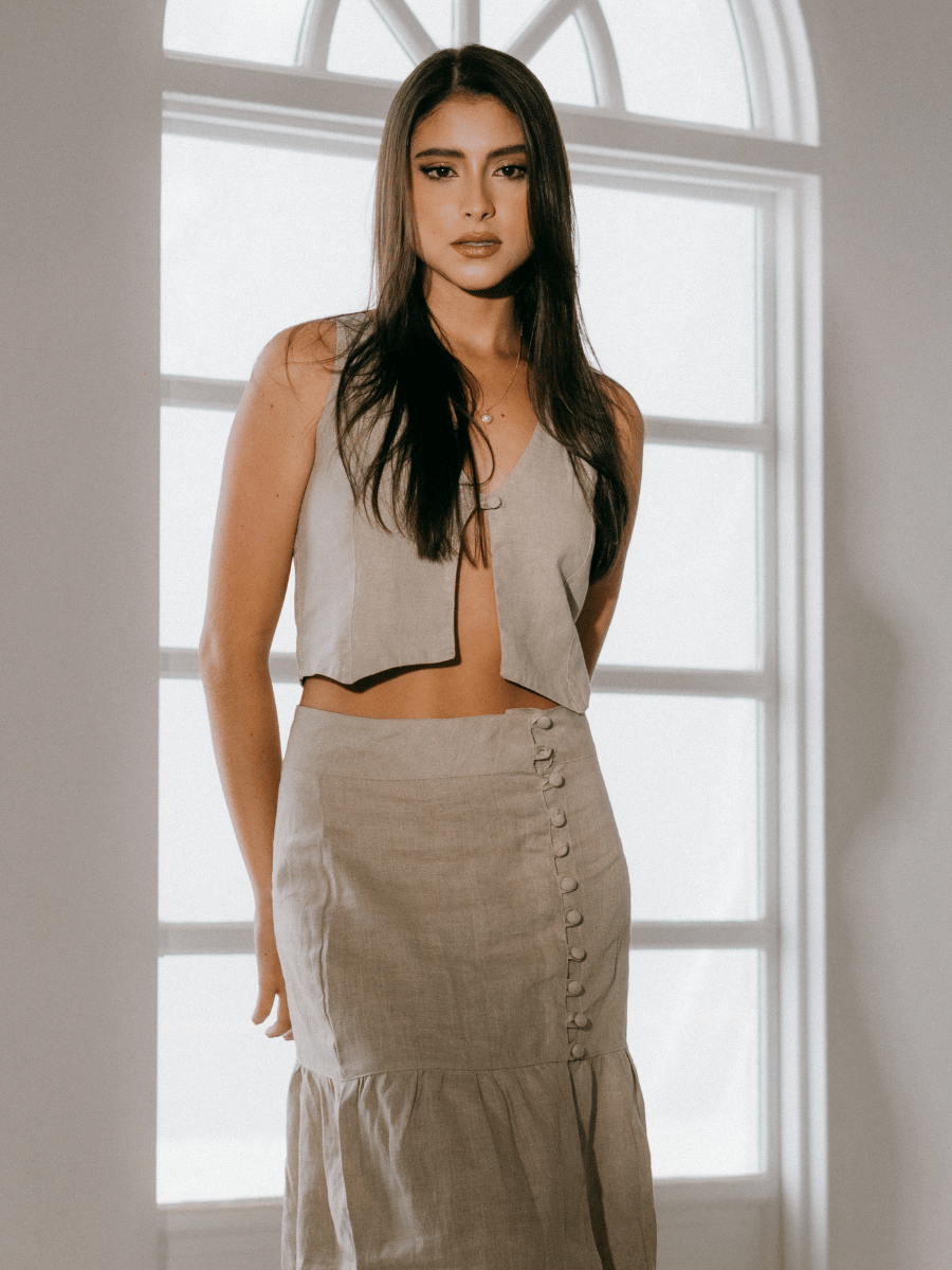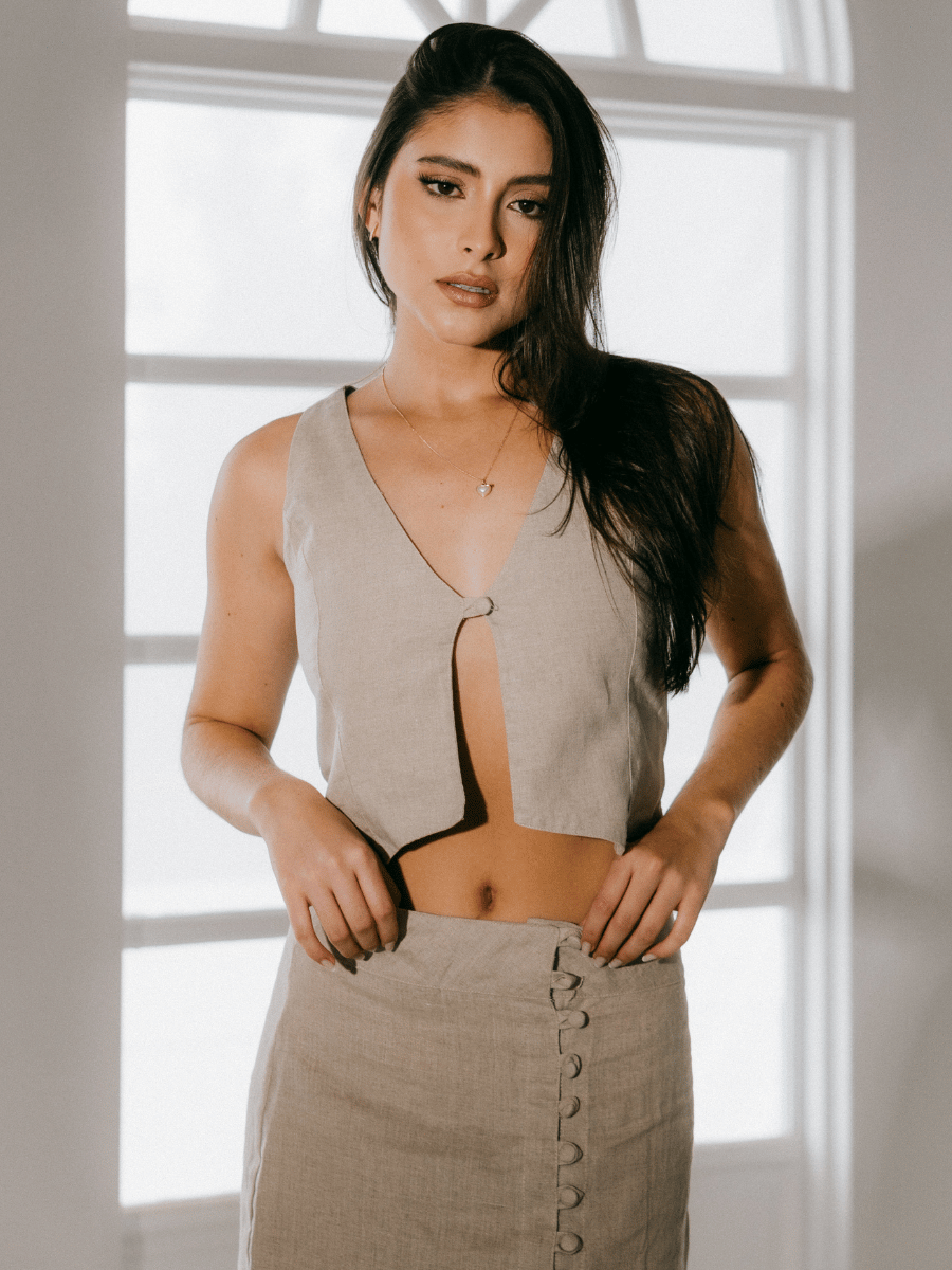 Este chaleco corto sin mangas está confeccionado en lino ligero, lo que lo convierte en una prenda fresca y versátil para los días más cálidos. Su diseño minimalista y atemporal es ideal para combinar con diferentes estilos, aportando un toque de elegancia y simplicidad. Perfecto para llevar encima de camisetas o blusas ligeras, o incluso solo para un look más casual.