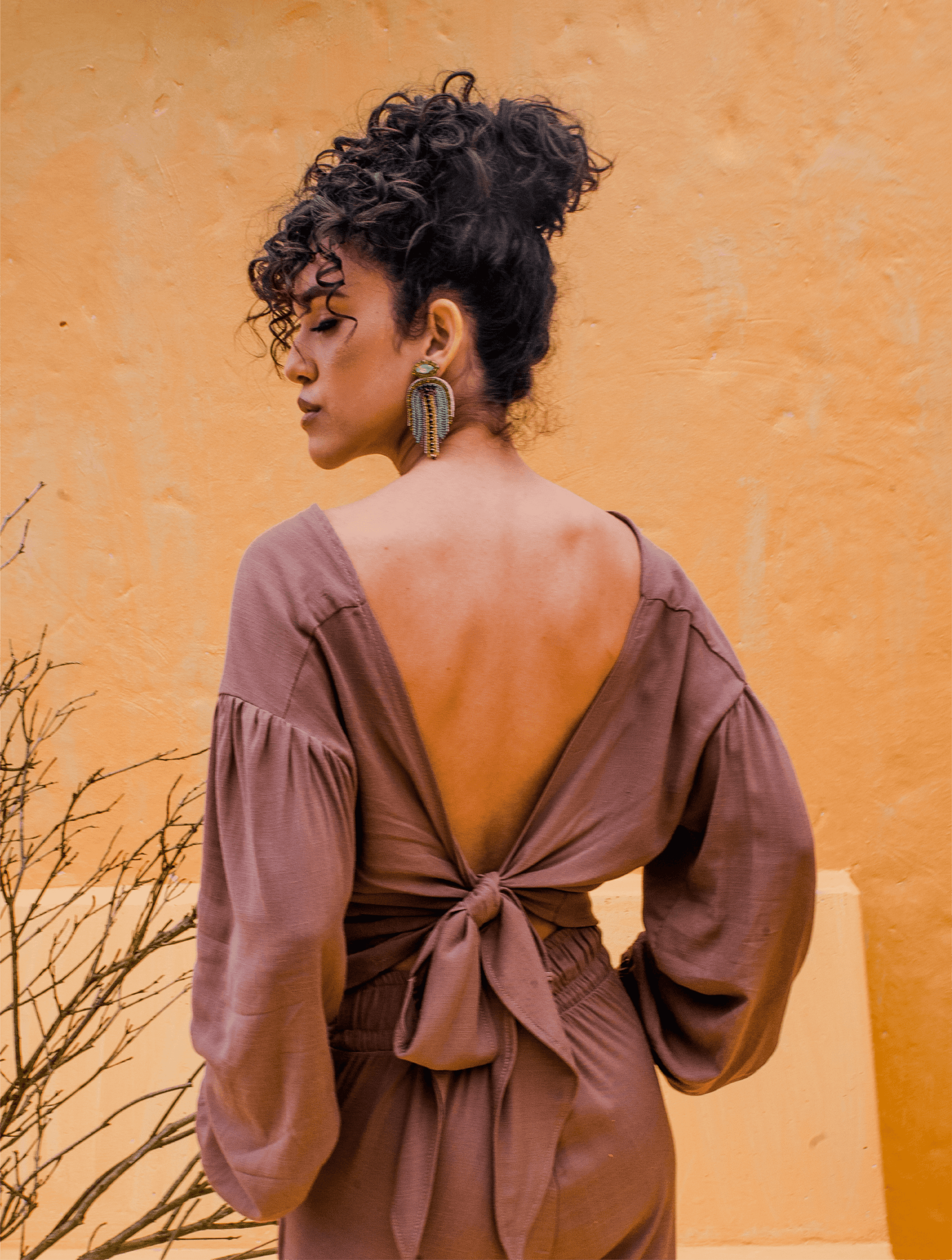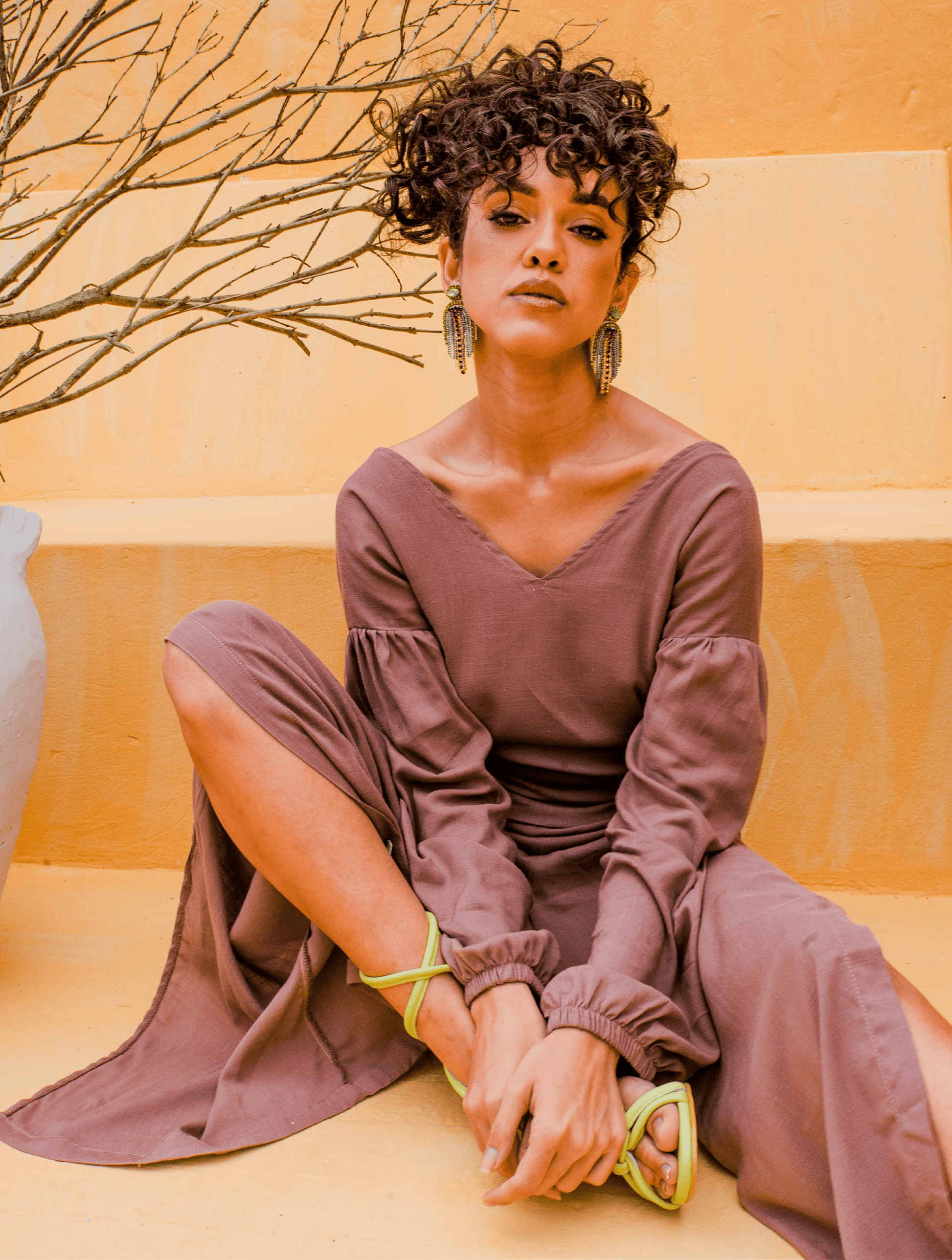 El set Kubeo está compuesto por un crop top de manga larga en lino con cuello en V, amarre en la espalda y puños con resorte, combinado con un pantalón de corte moderno con abertura lateral. Perfecto para un look relajado y sofisticado, ideal para ocasiones informales con estilo.