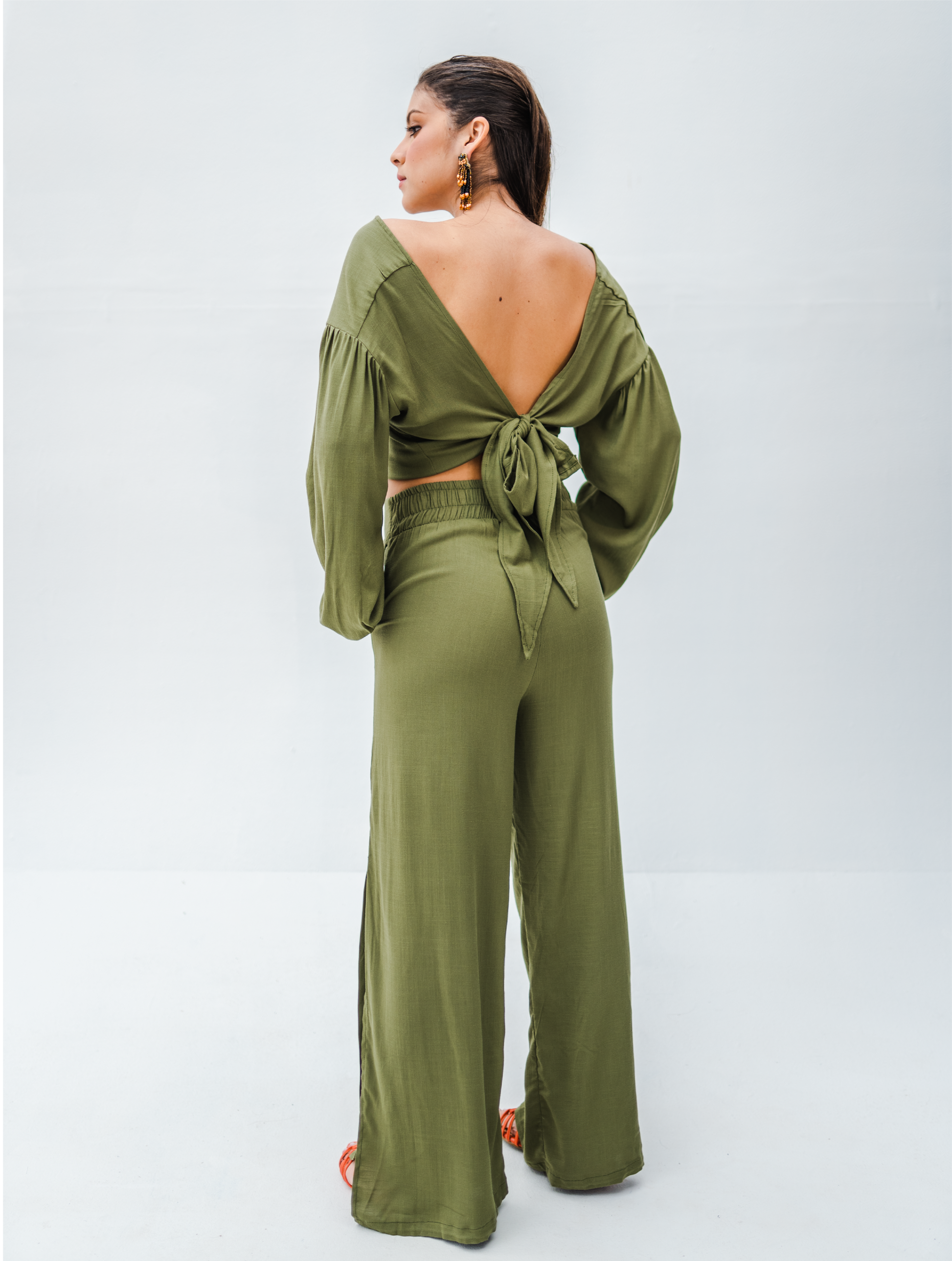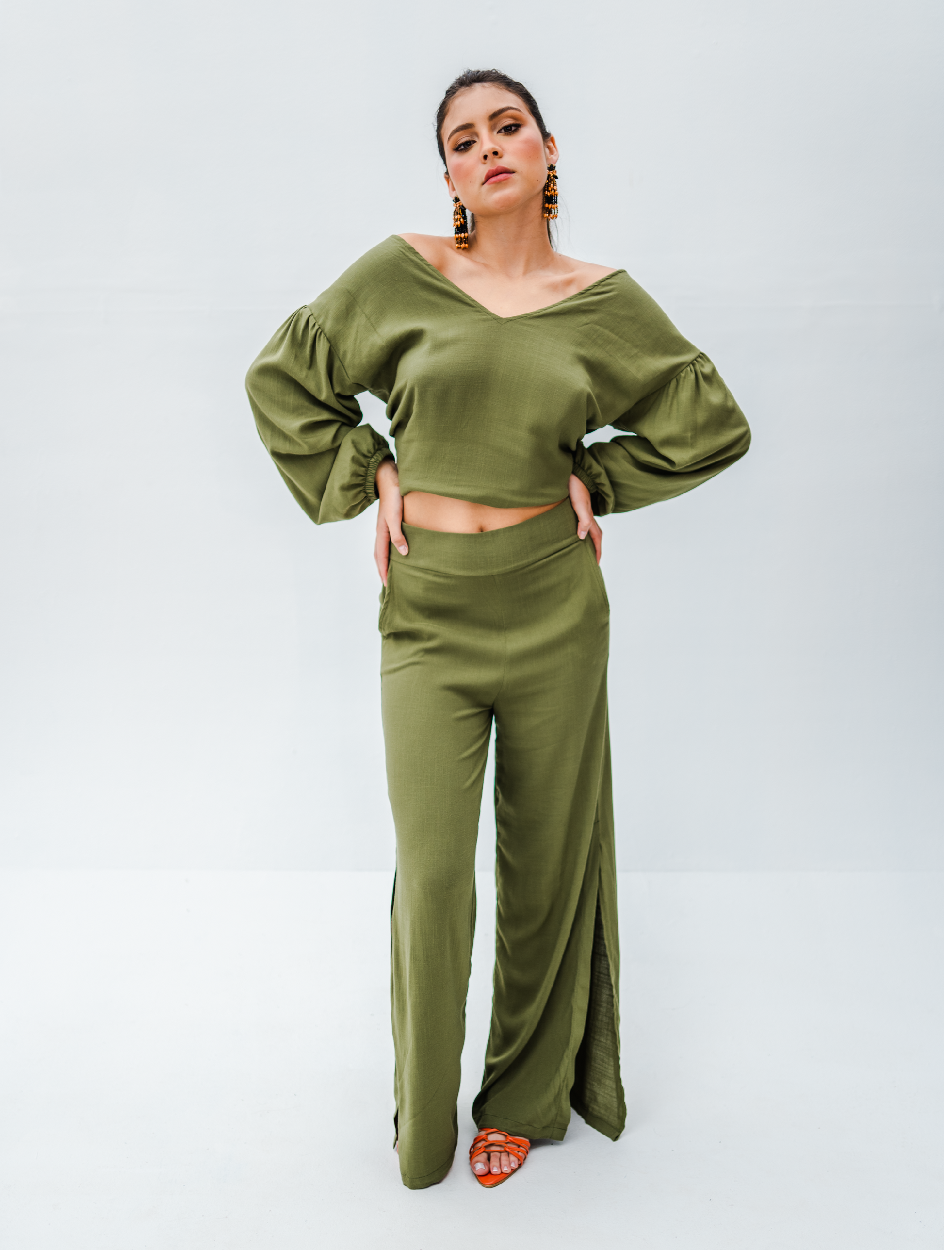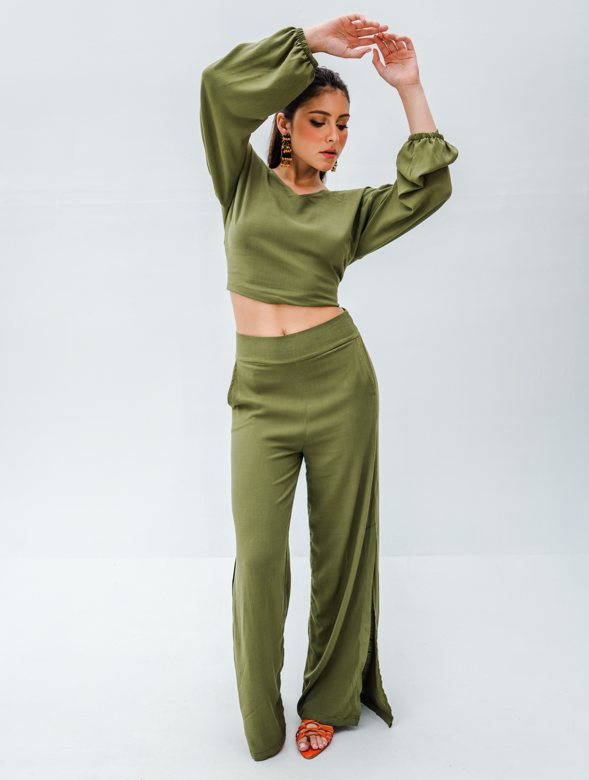 Set en lino crop top manga larga y pantalón con abertura Kubeo